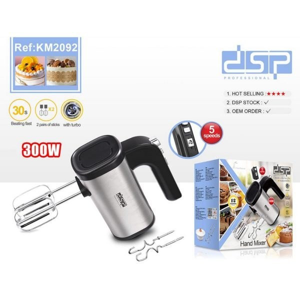 مشخصات کوتاه همزن DSP مدل KM2092 :👇 ⚡ قدرت موتور: 300 وات (موتور مسی 5525) 🌀 سرعتها: 6 سطح + حالت توربو 📏 ابعاد: 14.5 × 7.5 × 18 سانتیمتر 🔧 لوازم همراه: 2 همزن تخممرغ + 2 قلاب خمیر 🛡️ جنس بدنه: پلاستیک ABS + استیل ضدزنگ (201) 🔌 ولتاژ: 220-240 ولت 🎁 محتویات جعبه: همزن اصلی، 4 نازل، دفترچه راهنما